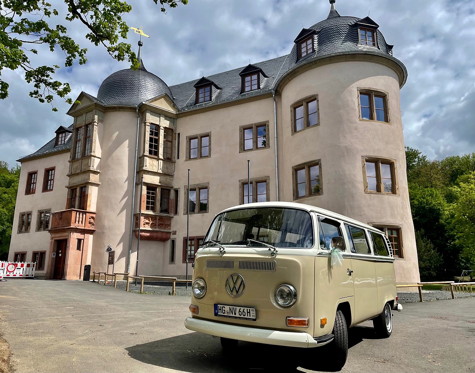 Zu einer schönen Hochzeit gehört ein schönes Schloss und ein schönes Hochzeitsauto (Bulli T 2, BJ 1971), farblich sogar auf das Schloss abgestimmt.
